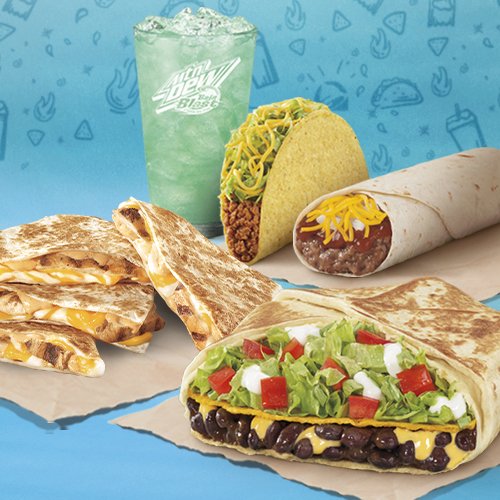 Includes a set of two Toasted Cheddar Street Chalupas, Nacho Cheese Doritos Locos Taco, a Crunchy Taco, Cinnamon Twists and a medium fountain drink.